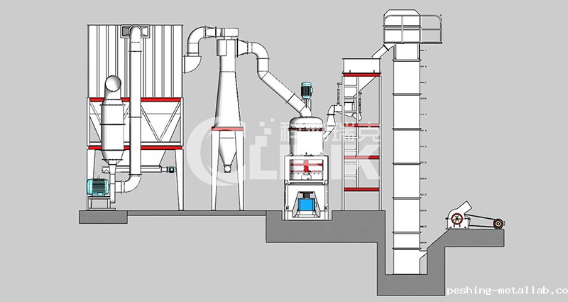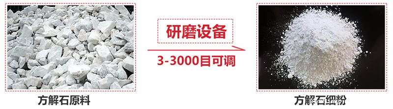 我们把方解石大块物料经破碎机破碎到能进入磨粉机的入料细度(15mm-50mm),经过破碎后的方解石小块物料经提升机送至料仓,再经振动给料机将其均匀定量的送入磨机研磨室内进行研磨。